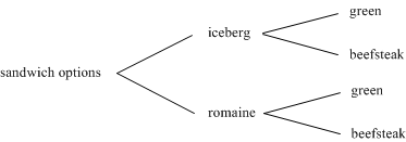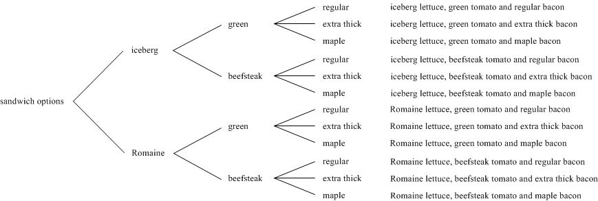 To get the sandwich combinations that I listed on the right hand side, you just follow each branch all the way to the end. For example, following the top branches gave me iceberg lettuce then green tomatoes and then regular bacon. Following the bottom branches gave me Romaine lettuce, beefsteak tomatoes and maple bacon. If you count up the combinations, you'll see that I ended up with the 12 that I said you should find on the previous page.
