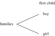 So how many different families are there? At first glance, you might say four because there are four branch endings but take a look at the middle two: {boy, girl} and {girl, boy}. Are those two really different? They both represent a family with one boy and one girl. The answer is, it depends. The big question you have to ask here is, "Does the order in which the kids are born make a difference?" If it does then the answer is four because {boy, girl} really means {boy first, girl second}. If the order doesn't matter then the answer is three because {boy, girl} and {girl, boy} both mean a family with one child of each gender.